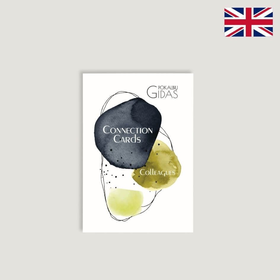 Angliškas pokalbių kortelių žaidimas “Colleagues” skatina atvirą ir žaismingą bendravimą, prisideda prie pozityvaus mikroklimato kūrimo. Klausimų korteles galima naudoti komandos formavimui, metiniams pokalbiams, naujų kolegų integravimui, kavos pertraukėlėms bei visur, kur norisi gilesnio pokalbio.